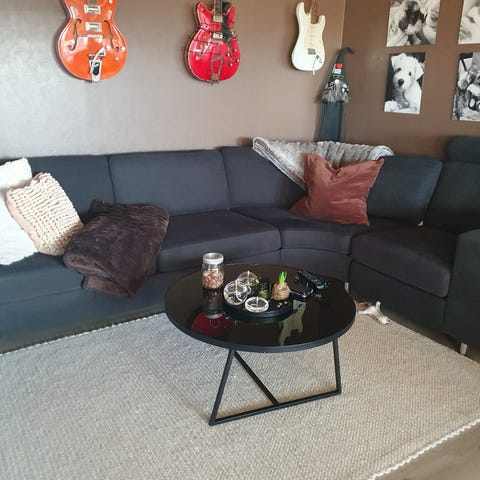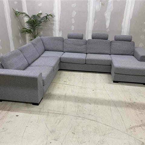 Pent brukt u-sofa, med to sjeselonger. Total bredde med armlen er 330cm. Venstre sjeselong med hjørne og totalt 230 lang. Høyre sjeselong 170 cm.