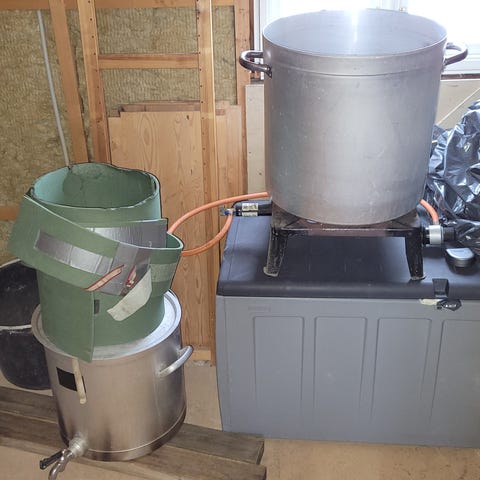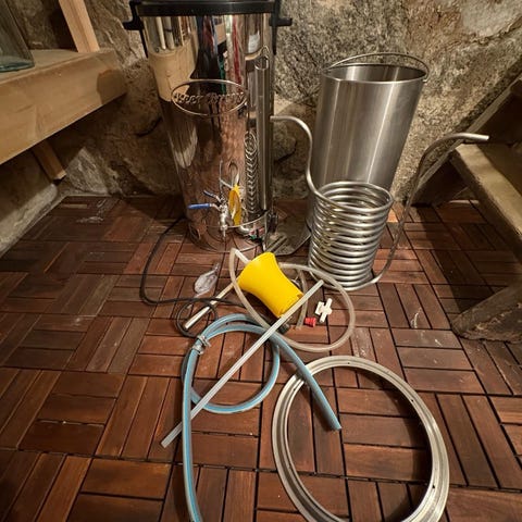 Kjele i rustfritt stål med kran 50 liter, perfekt til ølbrygging. Ca 40 cm i diameter og 40 cm høy. Med lokk.