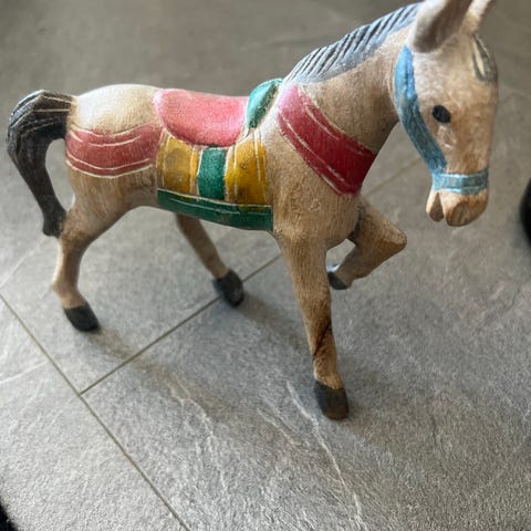 Kjøpt på marked i Frankrike. Var ganske dyr, men usikker på om den er «ekte gammel». Noe av treet som er brukt er brannskadet og den har et knekt øre. Veldig dekorativ og spesiell.