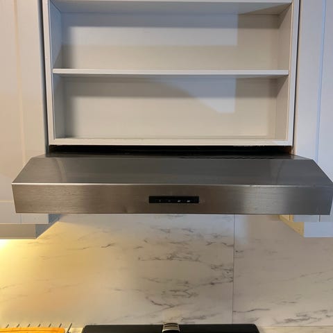 Selger en integrert uttrekkbar ventilator fra IKEA i rustfritt stål. Monteres i overskap og skjules pent når den ikke er i bruk – trekkes enkelt ut ved behov.
