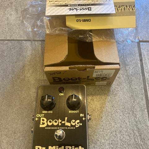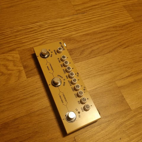 Helt ny VintageOverdrive gitar effektpedal i svart. Pedalen har kontrollknapper for Drive, Volum og Tone, samt inngangs- og utgangskontakter.