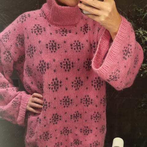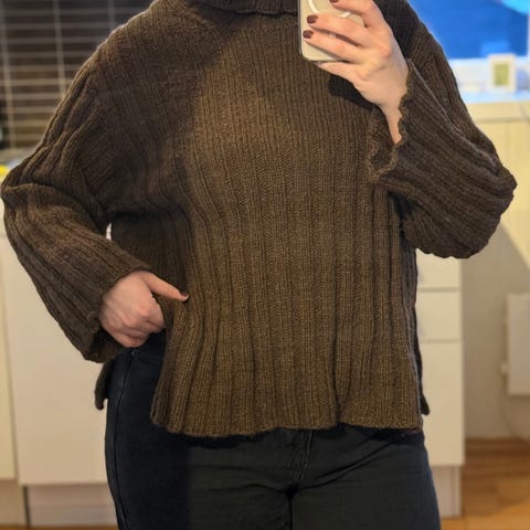 Oversized modell. Lengre bak enn foran. Strikket i Sandnes brushed alpakka - jeansblå