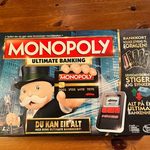Pent brukt, komplett med unntak av at det mangler to spillebrikker. Mangler også spillereglene, men man starter med 15 millioner (står på esken). Har nettopp skiftet batteri i bankterminalen ( to AAA-batterier).