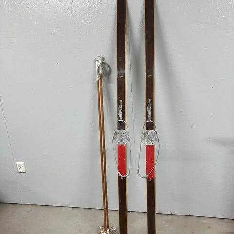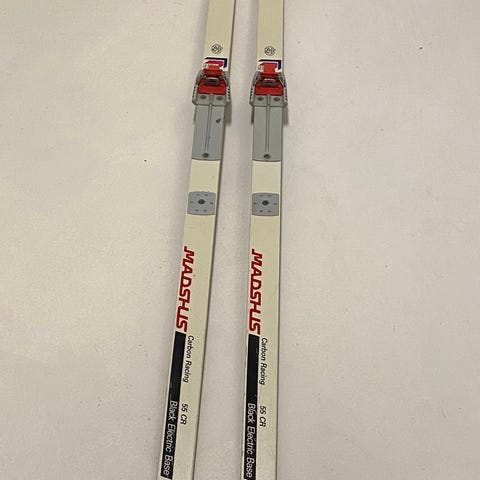 Madshus Clipper ski i tre med bindinger. Klassisk langrennsski med blå og brune detaljer. Egnet for bruk på snøflater.