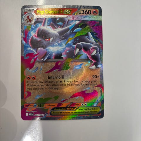 Pokémon Mega Charizard X EX samlekort med illustrasjon av Mega Charizard X. Kortet har angrepsverdier og spesifikasjoner for bruk i Pokémon Trading Card Game.