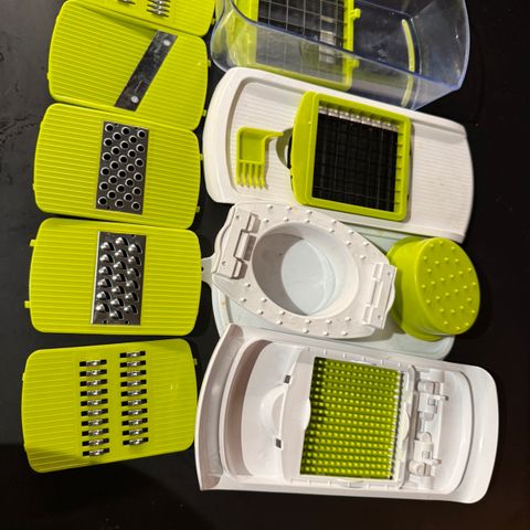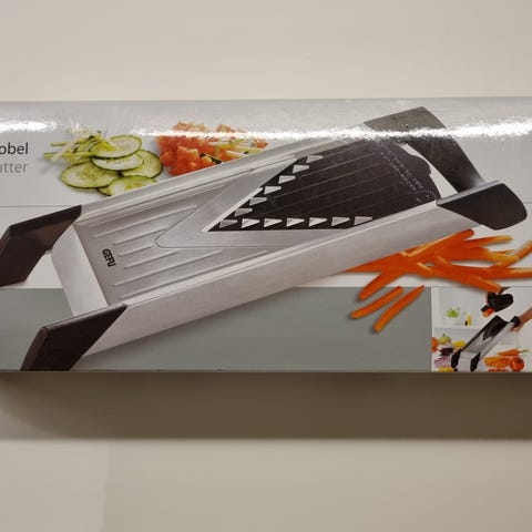 WMF Mandolinjern med 3 utskiftbare skjæreblad i svart plast og rustfritt stål. Egnet for presis skjæring av grønnsaker og frukt i ulike former og tykkelser. Inkluderer håndbeskyttelse for sikker bruk.