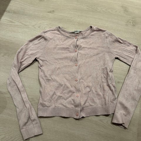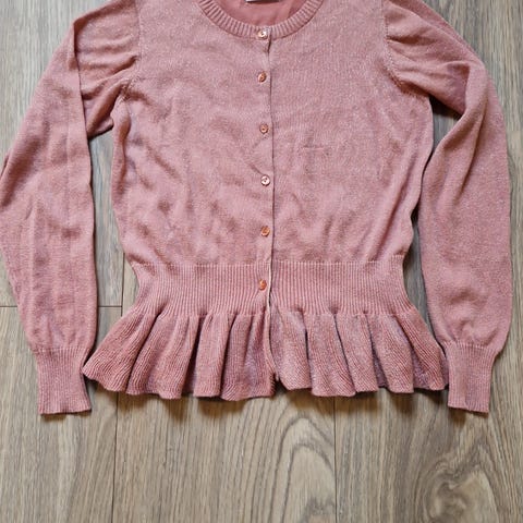 Molo cardigan i størrelse 146 for jenter. Cardiganen er rosa og laget av bomull. Den har knappelukking foran og ribbestrikkede mansjetter og kantdetaljer.