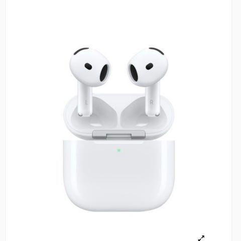 Apple AirPods 4 trådløse hodetelefoner i hvit farge. Leveres med ladeetui og USB-C ladeport. Designet for trådløs bruk med enkel tilkobling til kompatible enheter.