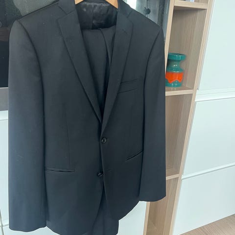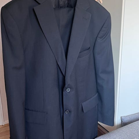 Dressmann dressjakke for herre i størrelse 44. Jakken er svart og laget av 65 % polyester og 35 % viskose i ytterstoffet, med fôr i 100 % polyester.