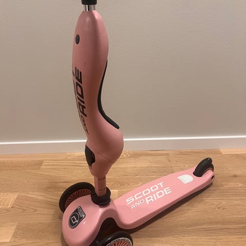 Scoot and Ride sparkesykkel i rosa farge. Designet med tre hjul for bedre balanse og stabilitet. Passer for barn som ønsker en enkel og trygg sparkesykkel.