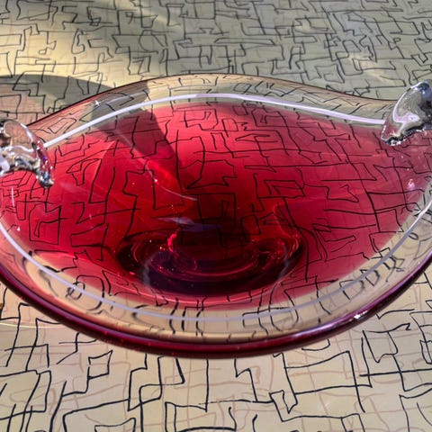 To nydelige boller/ vaser i boblet glass. Begge er designet av den kjente kunstneren Benny Motzfeldt. Den største er betydelig kraftigere og tyngre enn den minste og kan egne seg til vase eller dessert. Den minste kalles gjerne sildekrukke, men egner seg også godt til f.eks. syltetøy. De er som nye, uten skader av noe slag.