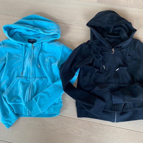 Juicy Couture hettejakke for dame i størrelse S. Genseren er blå og laget av polyester. Den har hette og glidelås foran. Ingen feil, mangler eller flekker. Som ny.