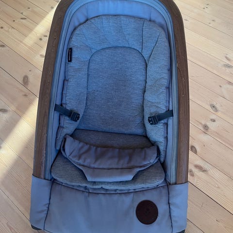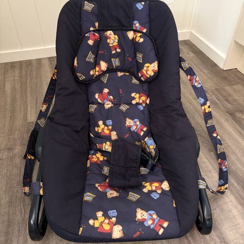 Chicco vippestol for barn med polstret sete i blått og hvitt stoff. Inkluderer sikkerhetssele og kontrollpanel med flere funksjoner for justering av bevegelse og lyd. Designet for bruk i hjemmet for å gi komfort og trygghet for barnet.
