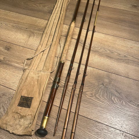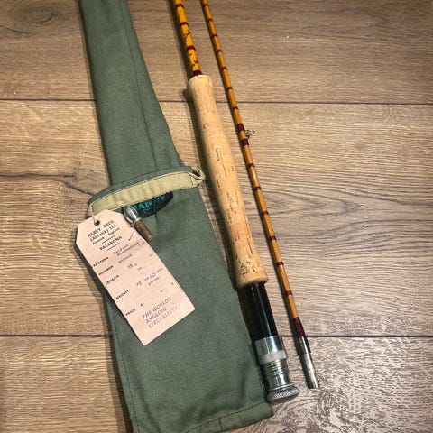 Selger en 9’ Hardy Palakona «Gold Medal» splitcane fluestang, laget i 1937 (E42308).