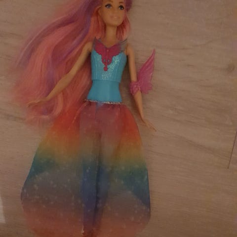 Barbie dukke med blå hårklemme i kruset hår
