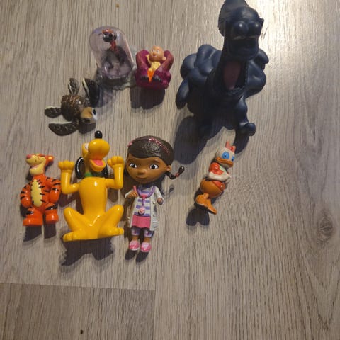 Disney treleker med ulike trafikk- og dyresymboler i farger. Lekene er laget i tre og inkluderer figurer som trafikklys, skilt og dyr. Passer for barn til lek og læring om trafikk og dyr.