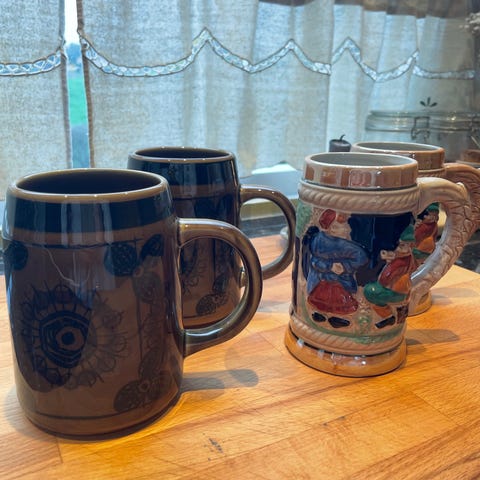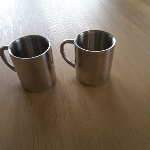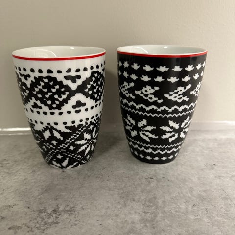 Sett med 4 krus i hvitt med svart mønster Høyde 11cm. Godt egnet for varme og kalde drikker.