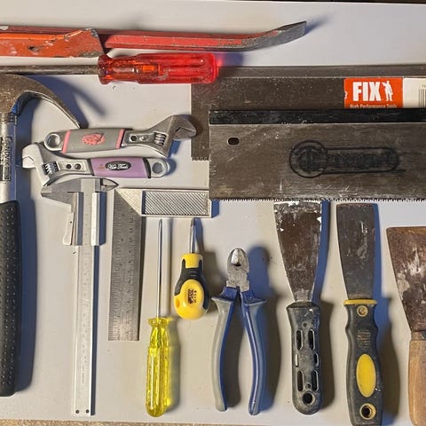 Verktøysett bestående av ulike skiftenøkler, skrutrekkere, unbrakonøkler, målebånd og annet tilbehør. Verktøyene er i forskjellige størrelser og typer, egnet for generelle reparasjons- og monteringsoppgaver.