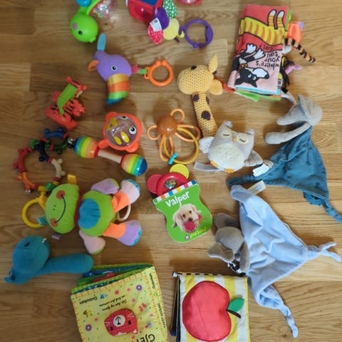 Nydelige leker. En bok, myk, lager lyder, en stående leke, pleide å lage lyder, vet ikke helt, kanskje må byttes batteri, eple, morsom, kan henges, en del kan dras ut(en bit som kan komme ut og klistres tilbake), en annen leke som kan henges i babygym eller lekes med. 50 kr per stykk. Kan sendes mot porto. Se gjerne mine andre annonser. Det er mye til salgs 😊 Inntektene går til Ukraina 🇺🇦