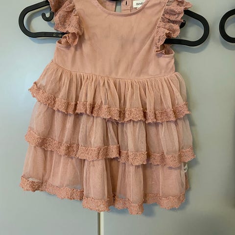 Newbie kjole i flerfarget bomull, størrelse 80, til jente. Kjolen har lang arm og er laget i et mykt bomullsmateriale.
