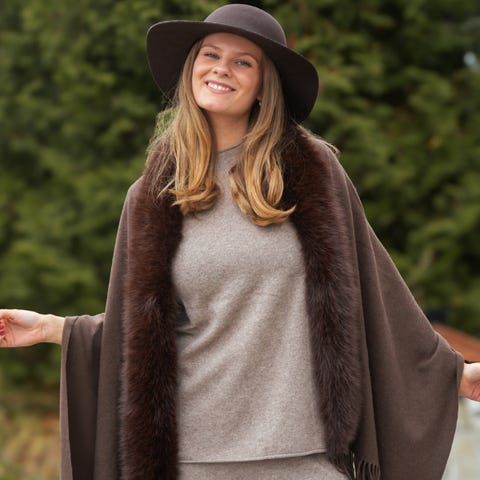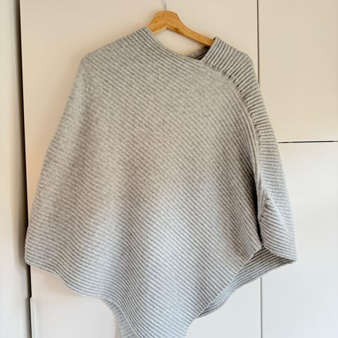 Grå poncho i ull (80% ull, 20% polyamide) med høyhals og lysebrune kanter (polyester) som ligner semsket skinn / nobuk. Pent brukt, uten nupper.