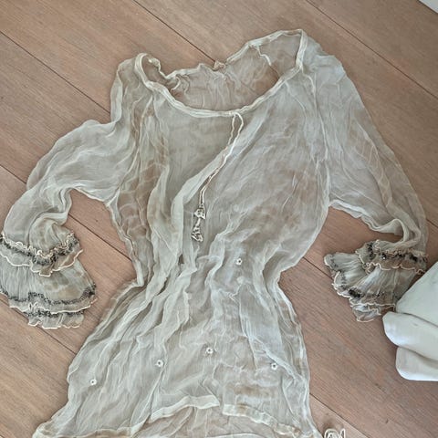 Svart med sølvdetaljer, innsving og kvinnelig form, åpen krage og bredt rundt håndleddene! Denne skjorta har alt, veldig veldig stilig til fest og hverdag. Godt bomullsstoff og lite brukt, fisket frem fra min tantes skap. Godt ivaretatt og rengjort. Kan passe en str S også.