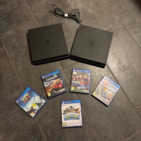 Playstation 4 spillkonsoll med to trådløse kontroller + strøm kabel og hdmi kabel.