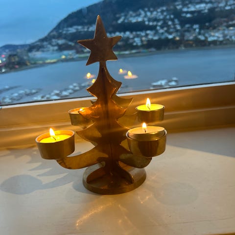 Lysestake i messing. Høyde 34 cm. Selges kr 350