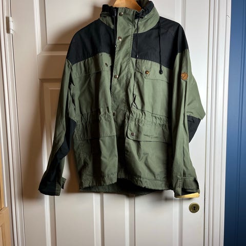 Fjällräven jakke i militærgrønn farge. Jakken har hette og fire lommer, samt forsterket på albuen. Laget for utendørs bruk med slitesterkt materiale. Brystvidde ca 60 cm, lengde målt midt bak ca 74 cm.