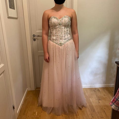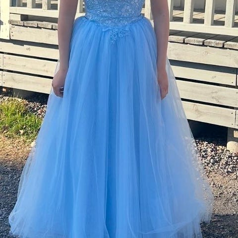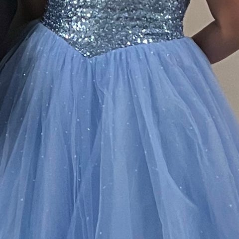 Marineblå ballkjole med nydelige detaljer. Kjøpt ny i høst. Brukt kun en gang. Den ser helt ny ut. I utgangspunktet var kjolen veldig lang, så den er lagt opp ca 10 cm. Vil anslå at den passer til jente på 150-170 cm i høyde. Størrelsen er XS, men den kan passe alt fra xxs-medium/large pga snøring i ryggen