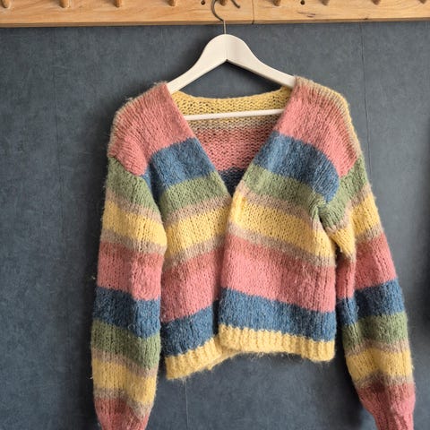 Selger hjemmestrikket egenkomponert cardigan i Maya merinoull