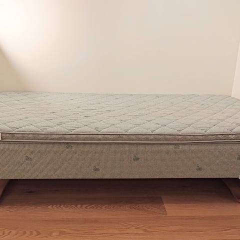 IKEA madrass i grått stoff med tilhørende metallben. Passer til enkeltseng eller daybed. Tynn overmadrass følger med. Madrassen har et enkelt og funksjonelt design.
