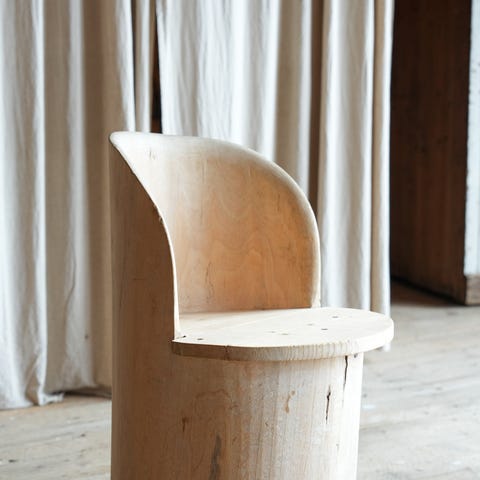 Massiv furu med karakteristisk sylindrisk base og polstret rygg. Et ikonisk norsk designobjekt fra Opsviks eksperimentelle periode.