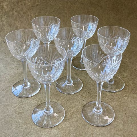 Krystallglass Schnappsglass i klart glass. Glasset har et dekorativt mønster og en slank stilk. Egnet for servering av schnapps eller andre små mengder drikke.