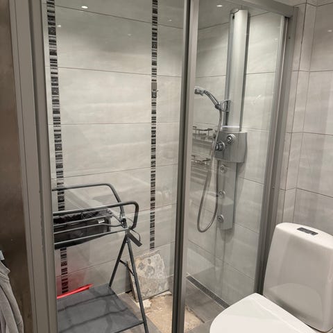 Dusjkabinett med hvit ramme og glassdører. Kabinettet har en dusjstang med hånddusj. Passer til baderom med begrenset plass.