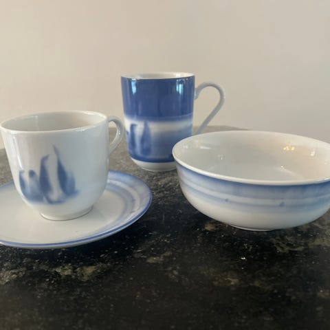 - 7 stk Kaffesett, inkl kopp, skål og tallerken. 200 kr/sett