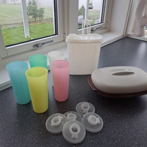 Tupperware Eksklusiv Heis Opp 1,5L , tett lokk. Utmerket til oppbevaring og servering av pickles, sylta rødbeter /agurk etc. Heis opp innerdelen og vri til siden så blir den stående.