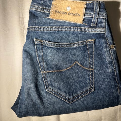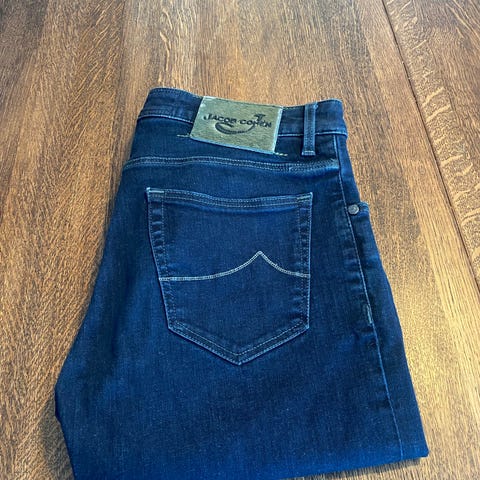 Jacob Cohën Jeans i størrelse M med midjemål W32. Fargen er mørkeblå, og materialet er bomull. Jeansene har klassisk design med lommer og knappelukking. Og karakteristisk brodert J i høyre bukselomme.