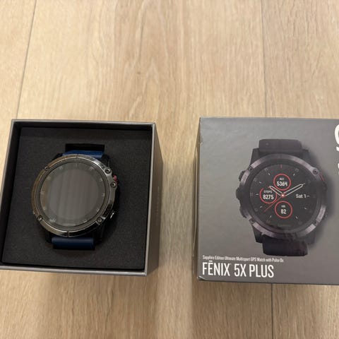 Garmin Fenix 5S Plus smartklokke med svart rem. Inkluderer lader og bruksanvisning.