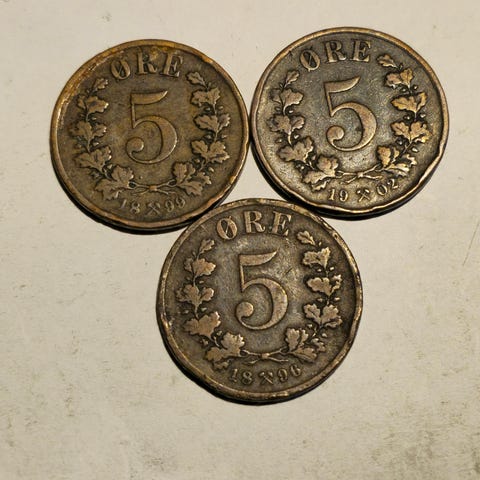 Femører fra 1875, 1876x3, 1896, 1907x2, 1912, 1915, 1919, 1936, 1937x2, 1942, 1944, 1955. Høyst varierende kvalitet (noen pusset), mest interessante er nok de to fra 1907, samt 1912 og 1915. Om ønskelig kan 12 fra perioden 1961-1973 inkluderes. Selger dekker porto (vanlig brev).
