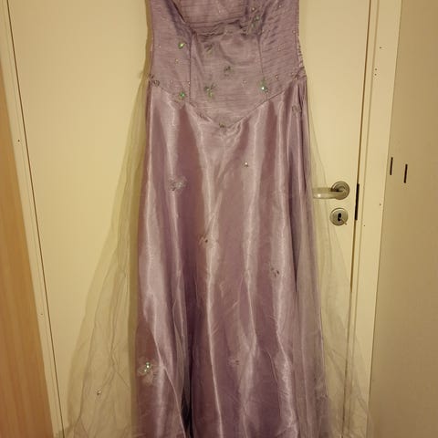 Nydelig ballkjole selges med tungt hjerte. Den har en nydelig lilla/rosa farge med knyting bak, tyll, ruching på siden og fine detaljer. Siden den har knyting bak vil den passe alt fra str.xs-m. Kun brukt en gang. Den har revnet helt nederst men dette er ikke så merkbart. Ta gjerne kontakt om du lurer på noe. 🌸💠🌸💠🌸