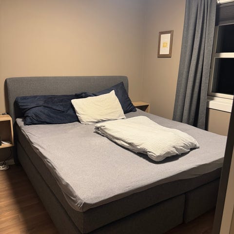Seng selges da vi ønsker mer plass på rommet og derfor går ned i størrelse. Sengen er ca. 6 år gammel og har vært godt ivaretatt. Madrassene er nylig dampvasket/renset. Overmadrassen er av memory, men har flekker som ikke lar seg fjerne, men det er fullt mulig å kjøpe ny overmadrass. Vi kan eventuelt kaste overmadrassen før salg dersom ønskelig.