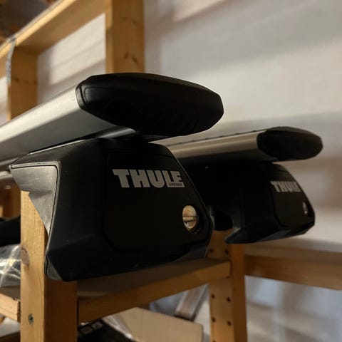 Thule Xtender utrekkbart skistativ med fester for klassisk firkantet takgrind (squarebar). Antar at festene kan byttes ut med fester for andre takgrinder. Nøkkel medfølger. Stativet er kun brukt noen få ganger.
