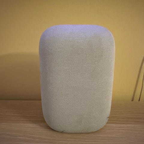 Google Nest Mini smart høyttaler i svart farge. En liten, rund smart høyttaler designet for stemmestyring og trådløs tilkobling. Leveres med strømadapter.