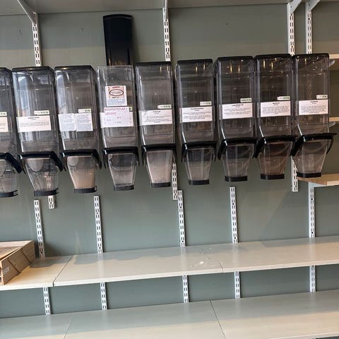 Ulike krydderbeholdere i forskjellige størrelser med gjennomsiktige lokk og etiketter for oppbevaring og dosering av krydder.