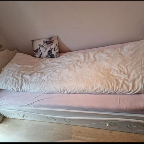 Selger Prinsesse Junior Barneseng. Gi din lille prinsesse en seng som passer for kongelige! Denne Disney Princess Junior sengen er det perfekte stedet å drømme stort og sove godt. Denne sengen er et vakkert, trygt og sikkert valg for småbarn. Sengen er lav og har en beskyttende sengeramme. Sengen har en avtagbar regnbueformet kalesje. To praktiske oppbevaringsbokser under sengen medfølger. Madrass og et laken følger med.