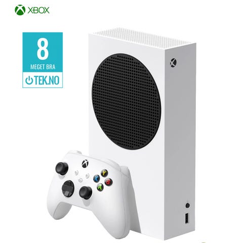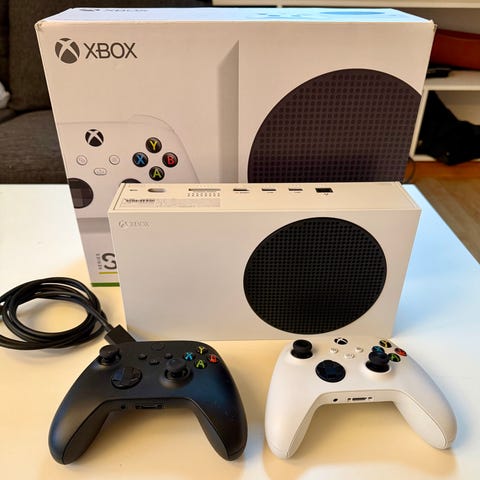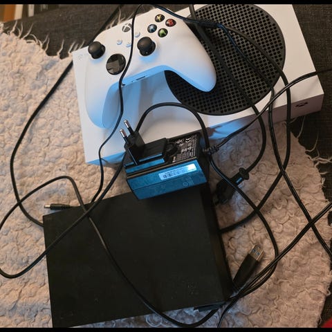 Følger med en blå kontroll, hdmi kabel og strømledning.