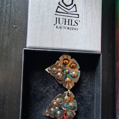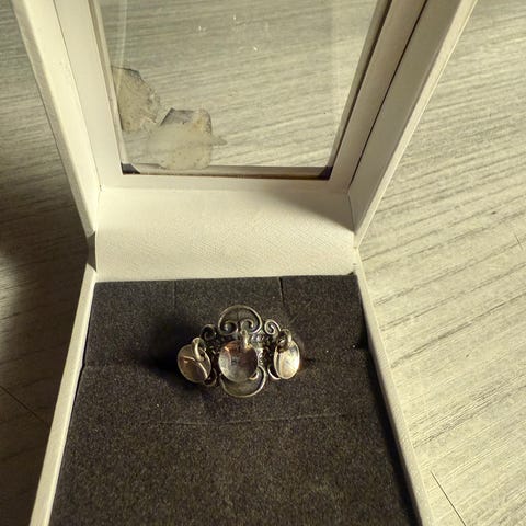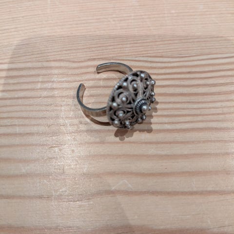 Lite brukt bunadsring i sølv med blå stein. Det er stemplet R 830 S. Kjøpt via samisk nettbutikk, men selges flere steder. Ligget i en skuff i flere år og søker nå en eier. Ringen er blank, men ble oksidert over tid. Har polert/renset, men en skikkelig rens vil få den til å skinne godt igjen.