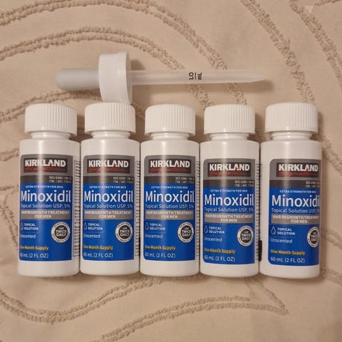 Har noen nye pakker med Minoxidil 5% dusjspray til stimulering hårvekst og motvirke håravfall.