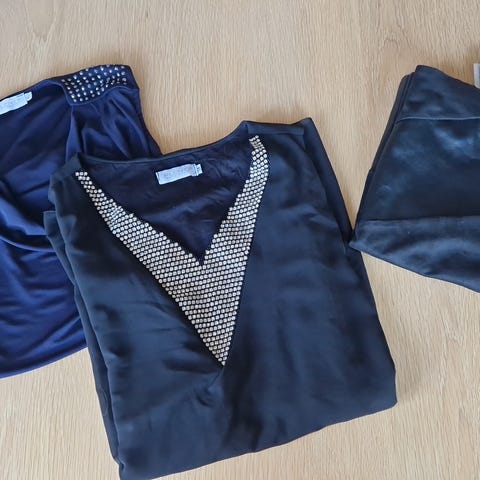 Flere farger bluser, topper og en kjole i størrelse XL . Klærne har ulike farger og detaljer som volanger og folder, og er laget i materialer som gir en myk og behagelig passform. God klær, pent brukt. Et kupp .7 plagg. Ulike merker.